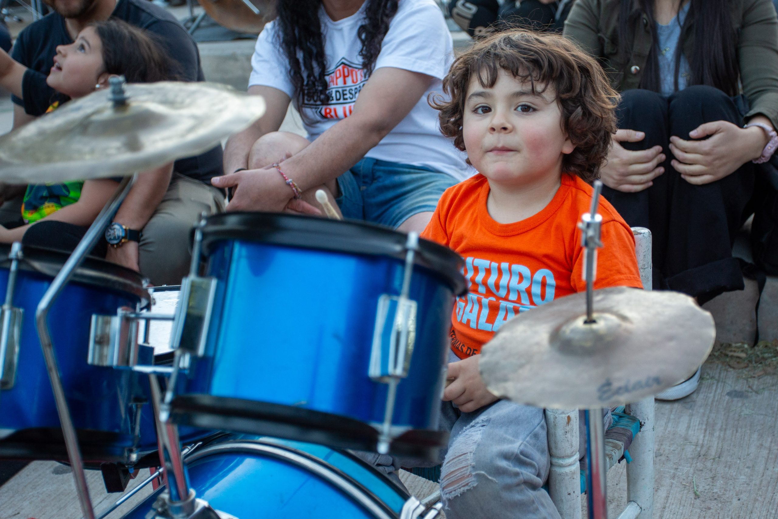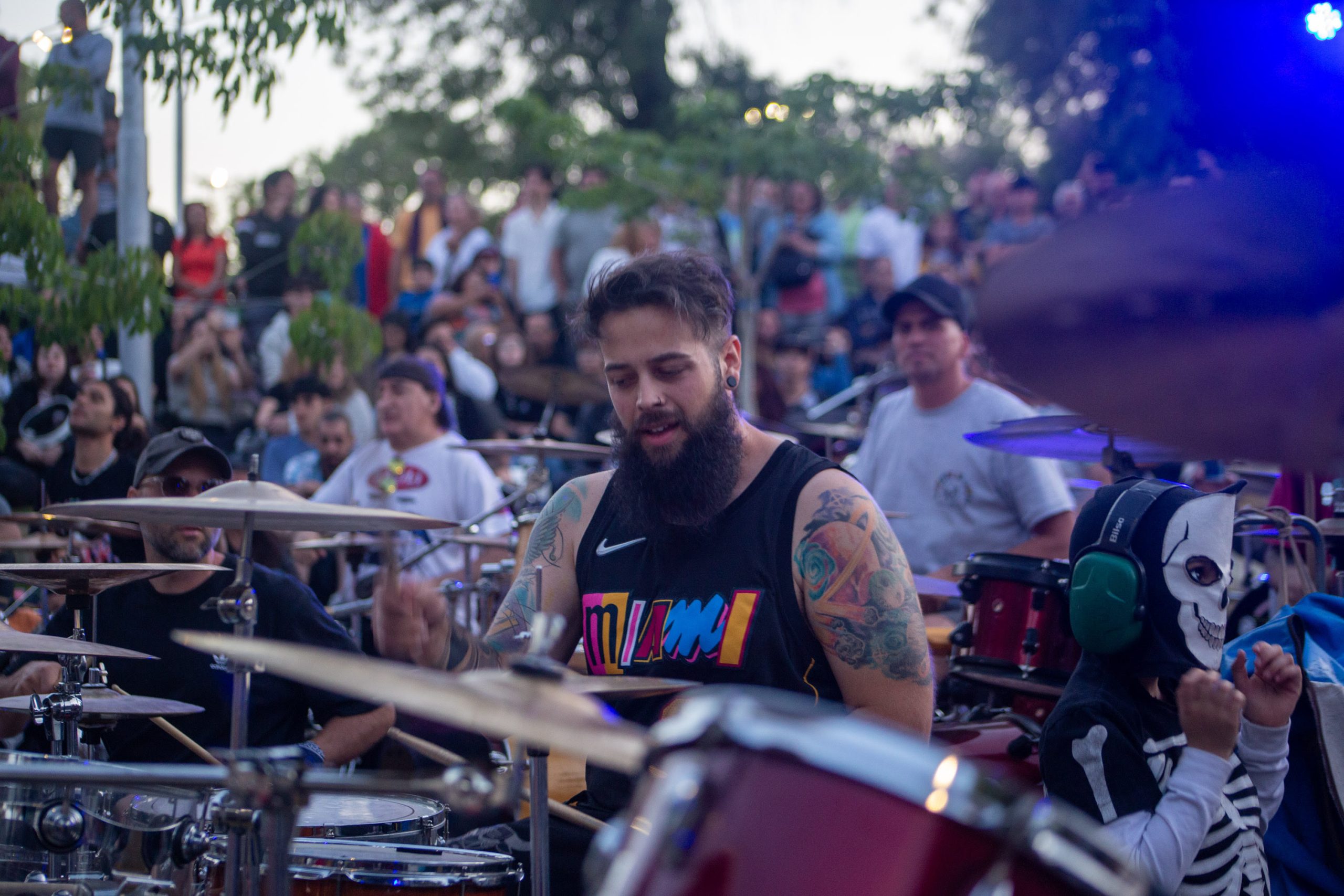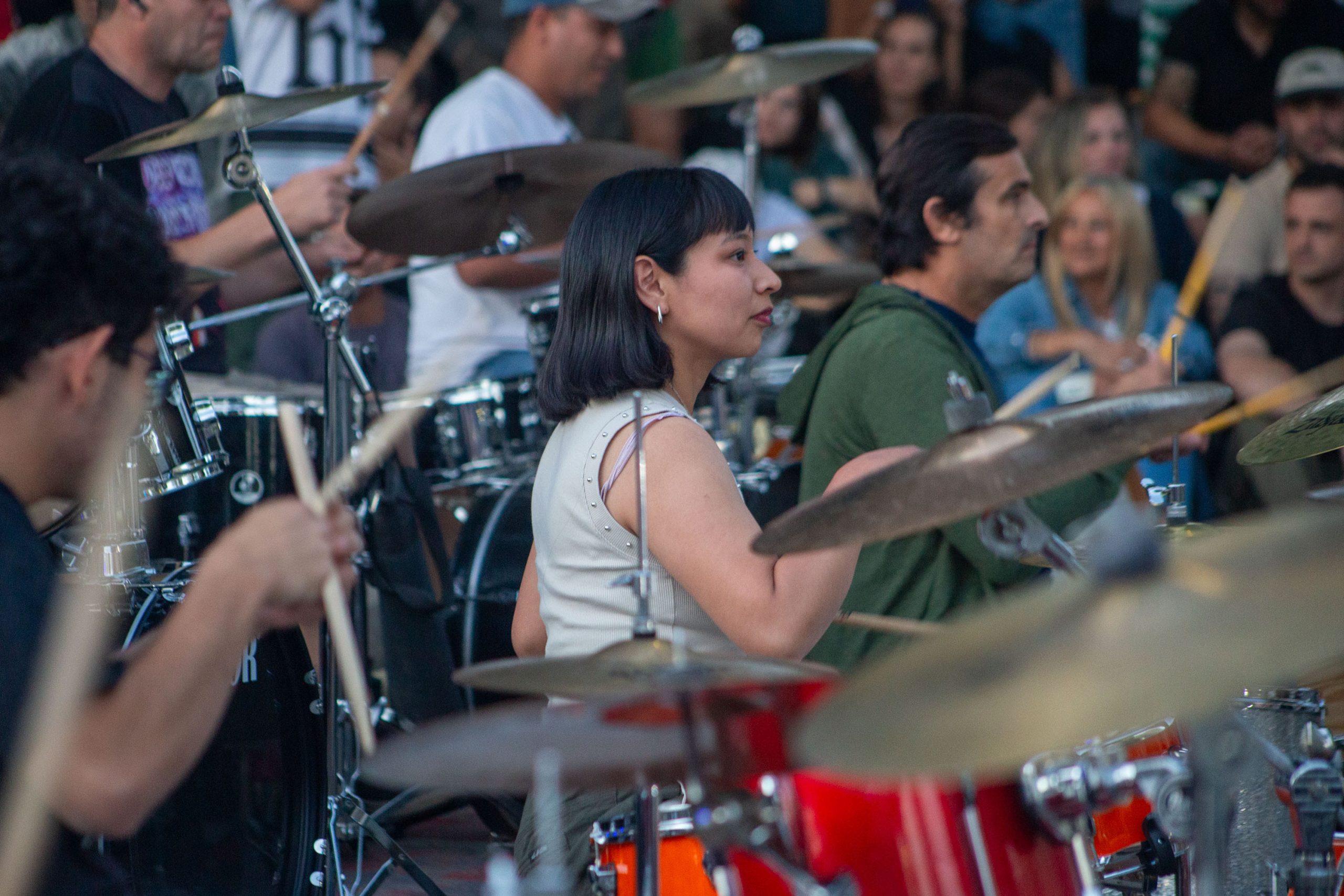 Después llegó la interacción de estos cinco bateristas con los más de ochenta músicos que respondieron a la convocatoria. Sorprendió la gran cantidad de mujeres que llegaron con sus tambores y también la de niños de todas las edades, que desde muy chicos muestran su amor por la batería.