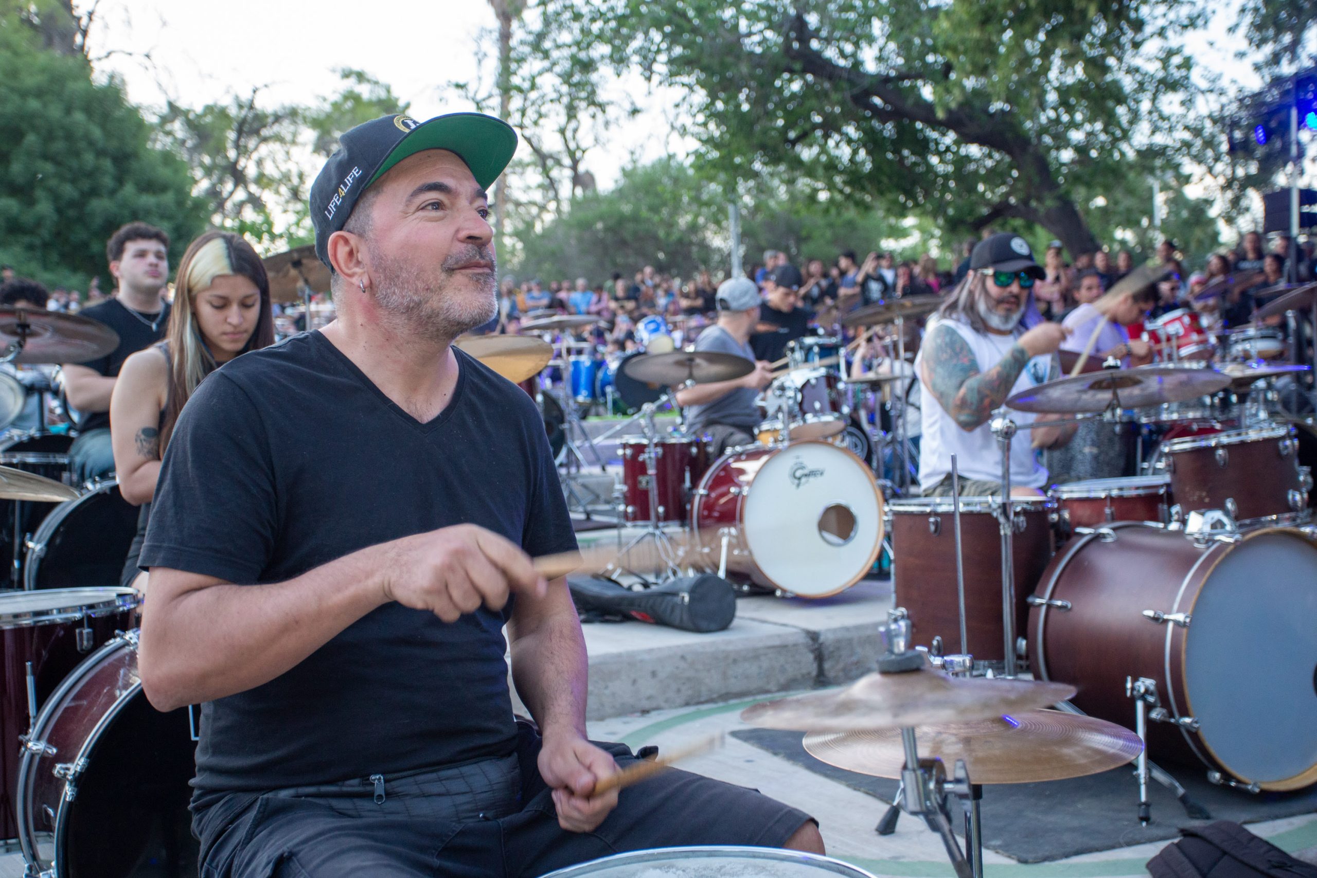 La versión mendocina de Baterías a la Plaza fue un verdadero éxito. El evento, impulsado por Sergio Masciotra y Jorge Araujo, reunió a más de 80 bateristas en el teatro Gabriela Mistral, donde tocaron en simultáneo junto a cinco grandes exponentes del instrumento: Gustavo Melli, Daniel Ávila, Didier Turello, Masciotra y Araujo.